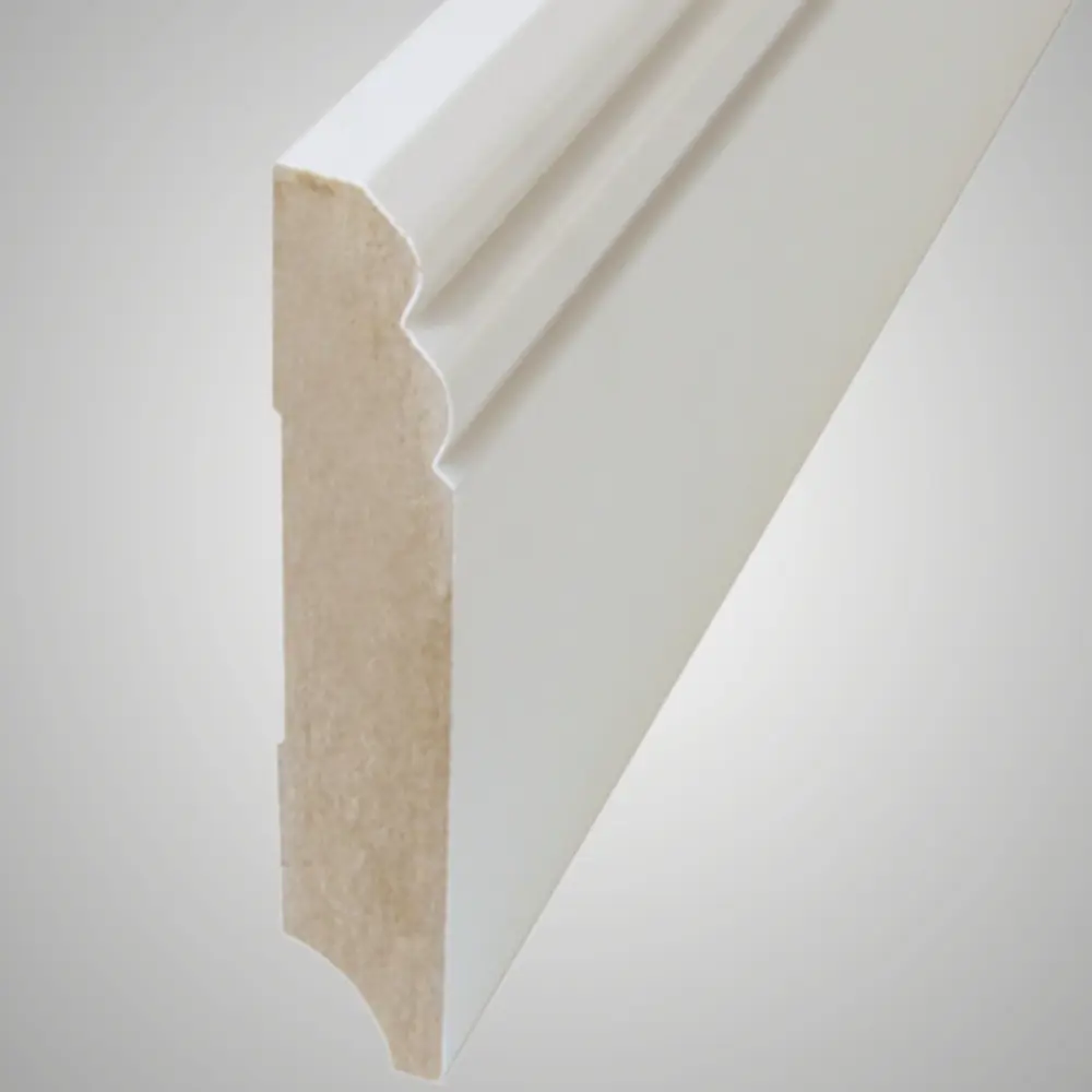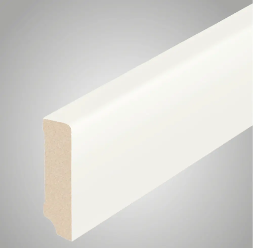 Weiß furnierte Fußleisten auf HDF Basis Weiß lackiert: RAL 9016 Inhalt: 8 Stück pro Bund Abmessungen: 58 x 16 x 2500 mm