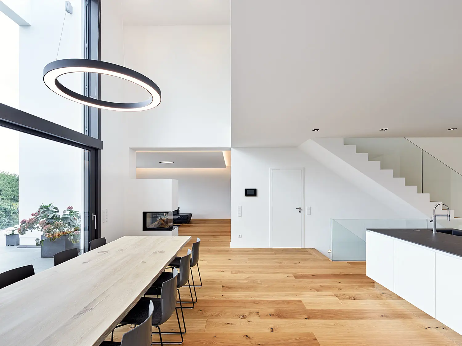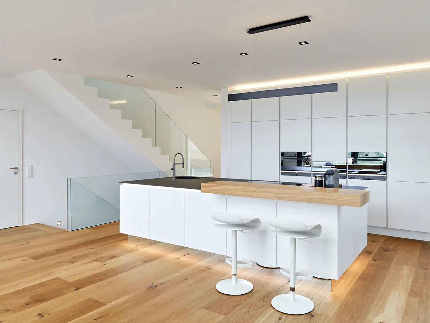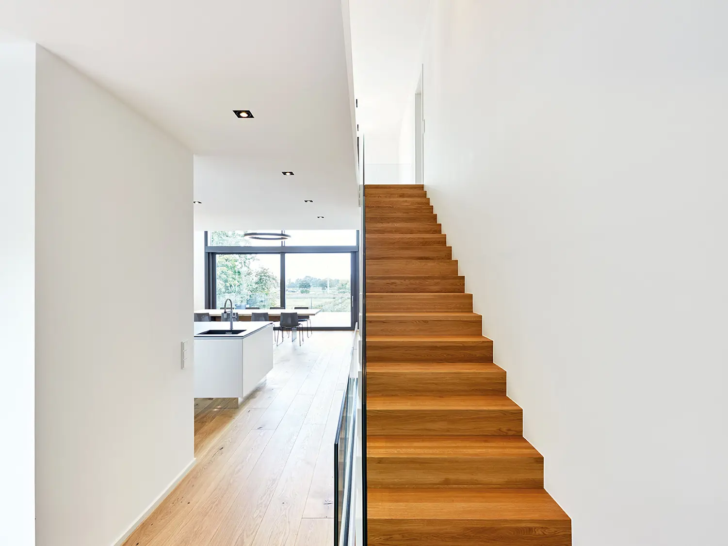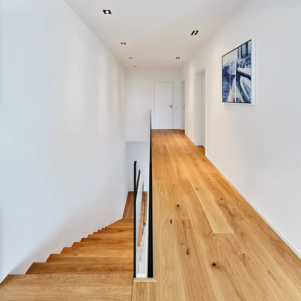 ‘The demands on the wooden floor were very high from the beginning. The specifications of the architect were explicit: The use of wood should be a cosy contrast to the architecture of the building and at the same time visually connect the living spaces’, reveals Bodo Gschwendtner, owner of the company Parkett Gschwendtner and the person responsible for the floor. ‘At the same time, the wood floor had to remain attractive for decades regardless of changing interior design styles. Like the whole architecture, the floor should adapt to later stages in the life of the owner and stay beautiful for a long time.’