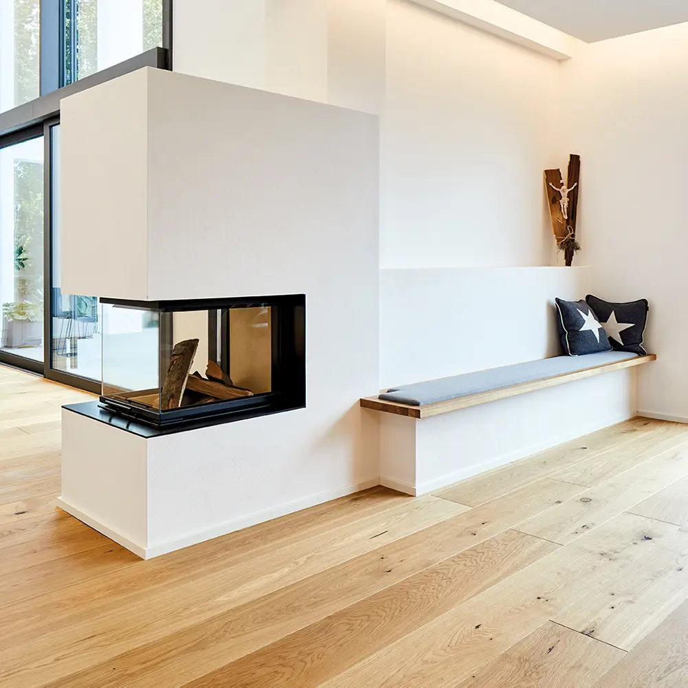 The 30-cm wide Chaletino oak flooring on the ground floor creates a warm and uniform overall impression, complemented by rustic planks on the first floor.