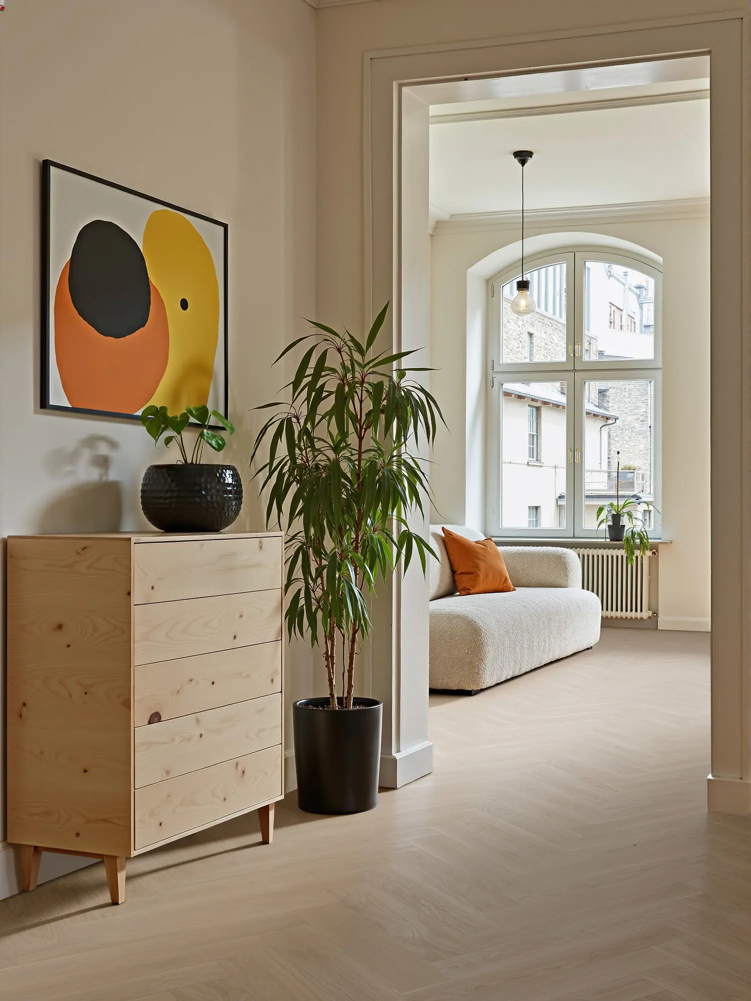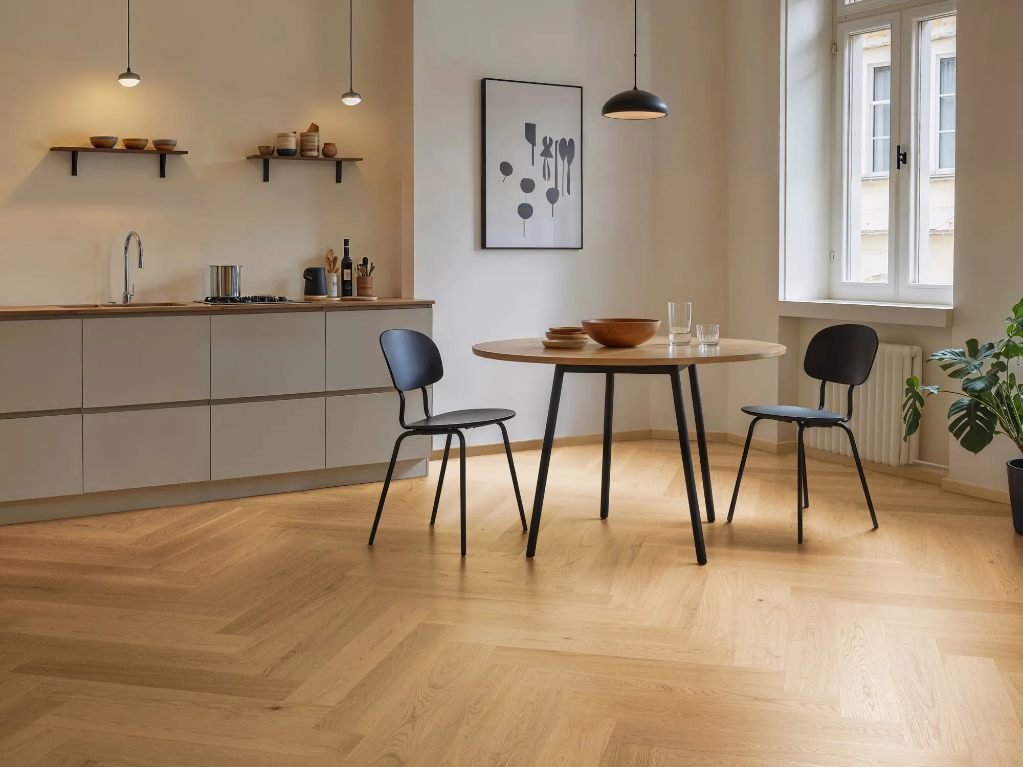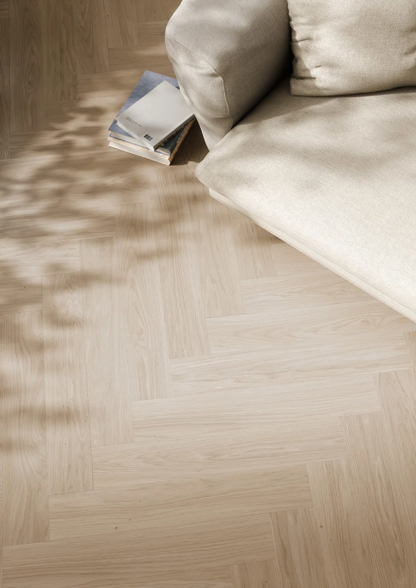 With Herringbone T/G 10.5 × 137, BOEN expands the possibilities of the classic herringbone pattern. The new format was explicitly created for stylish, creative-pattern floors, where the balanced length of its strips works well in both smaller and larger spaces. With a thickness of just 10.5 mm, it is ideal for installation over underfloor heating, making it the perfect choice for both new buildings and renovations. The brushed surface emphasises the natural structure of the wood, making touching the floor a unique sensory experience. Four elegant colours (Transparent, White, Pale White and Soft Brown), combined with different gradings and three surface treatment options, offer an extensive palette of variants for custom living space concepts.