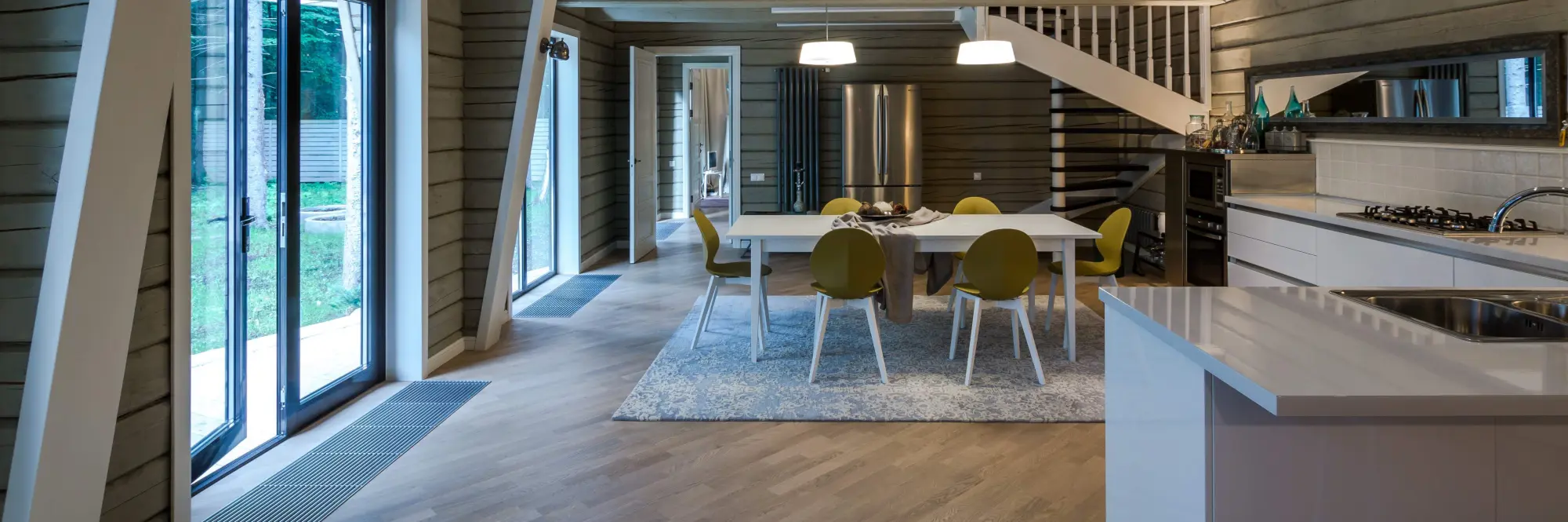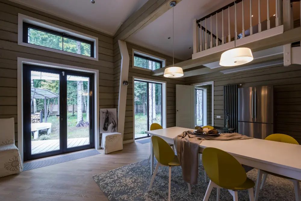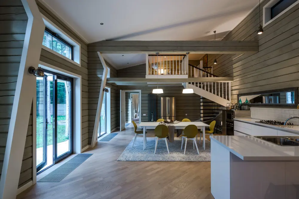 For this house in the green Russian forest, the designer Ekaterina Gracheva has chose a light wood floor witch matches perfectly with the grey logs used for the walls.