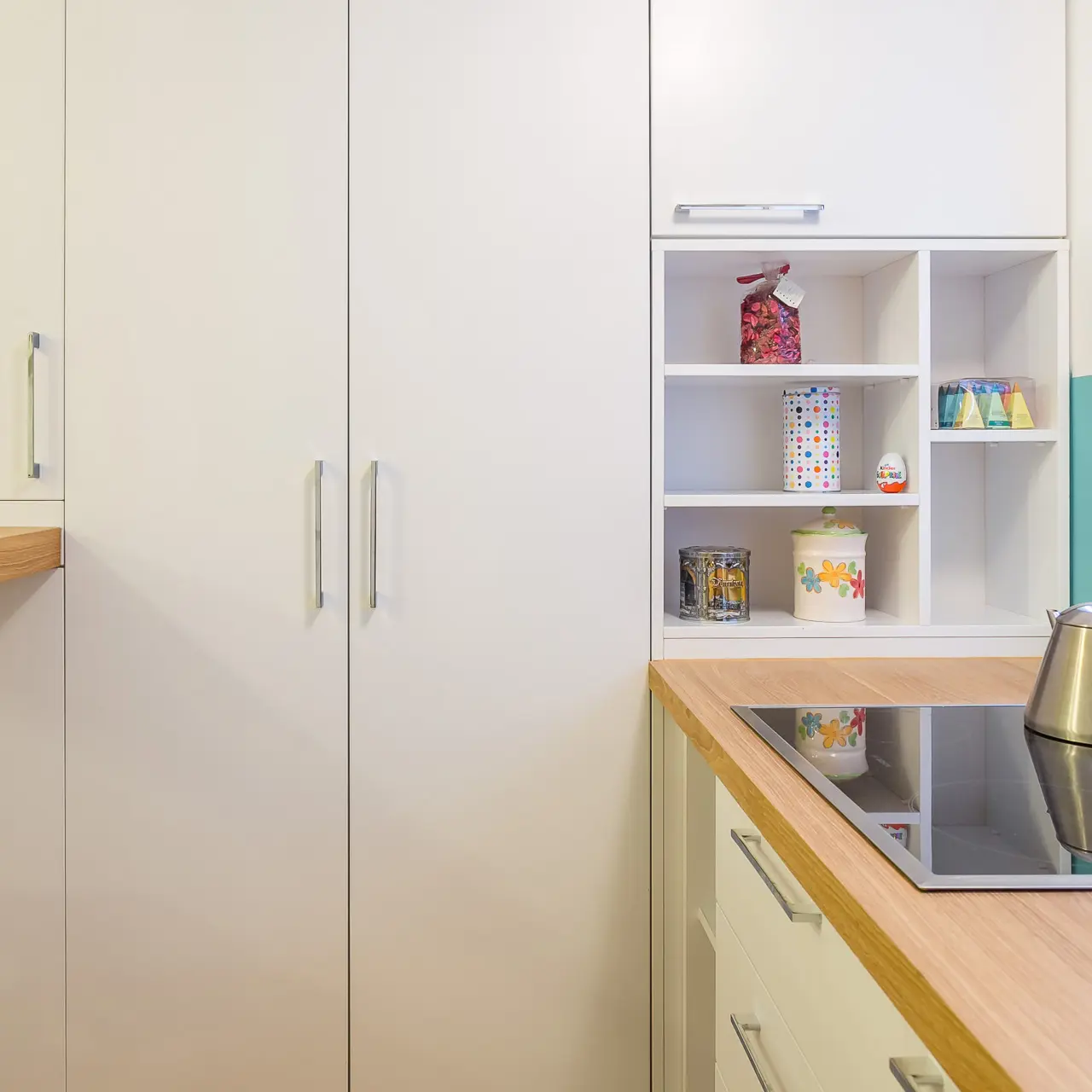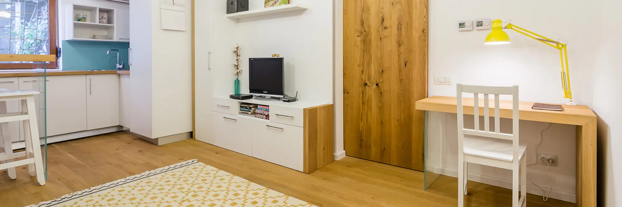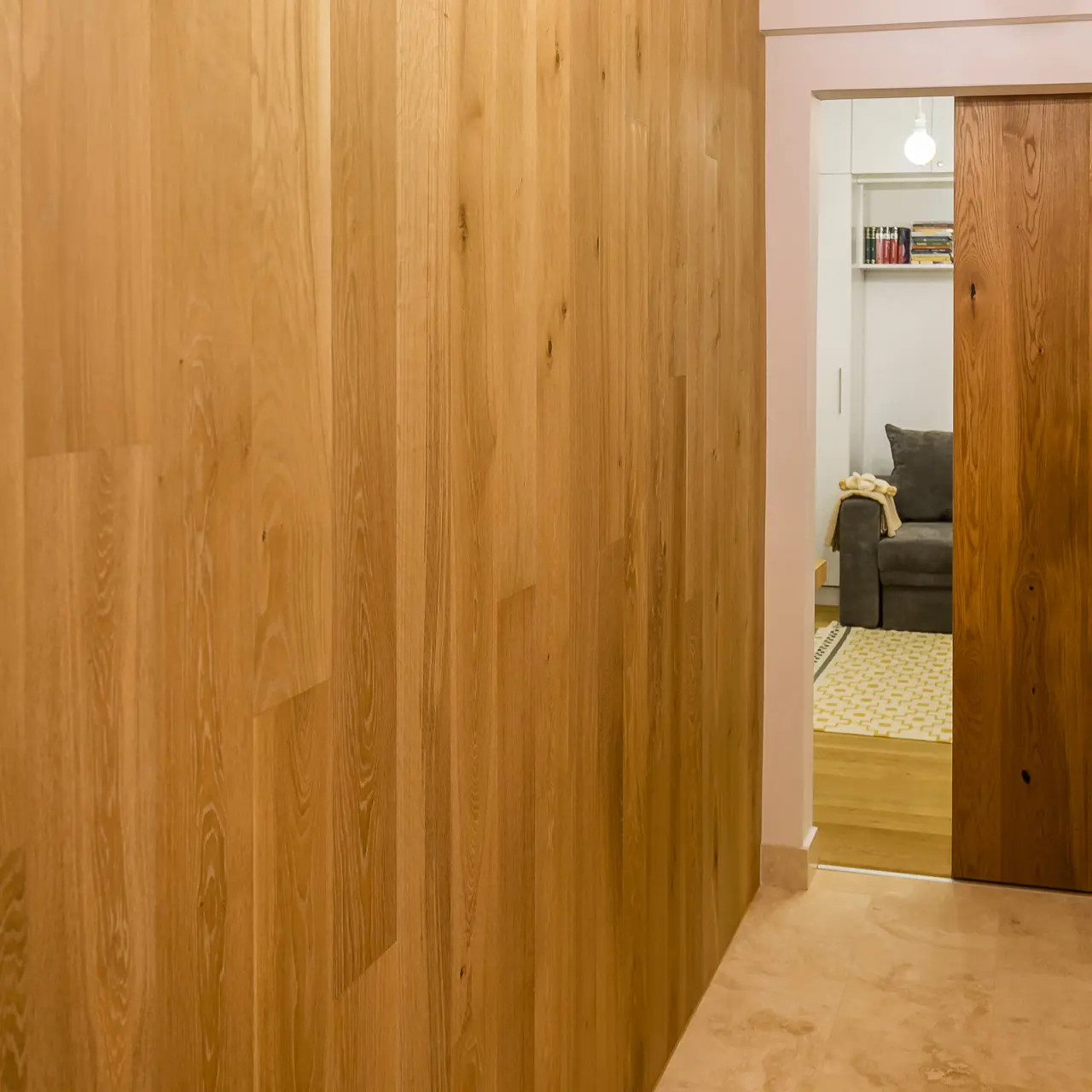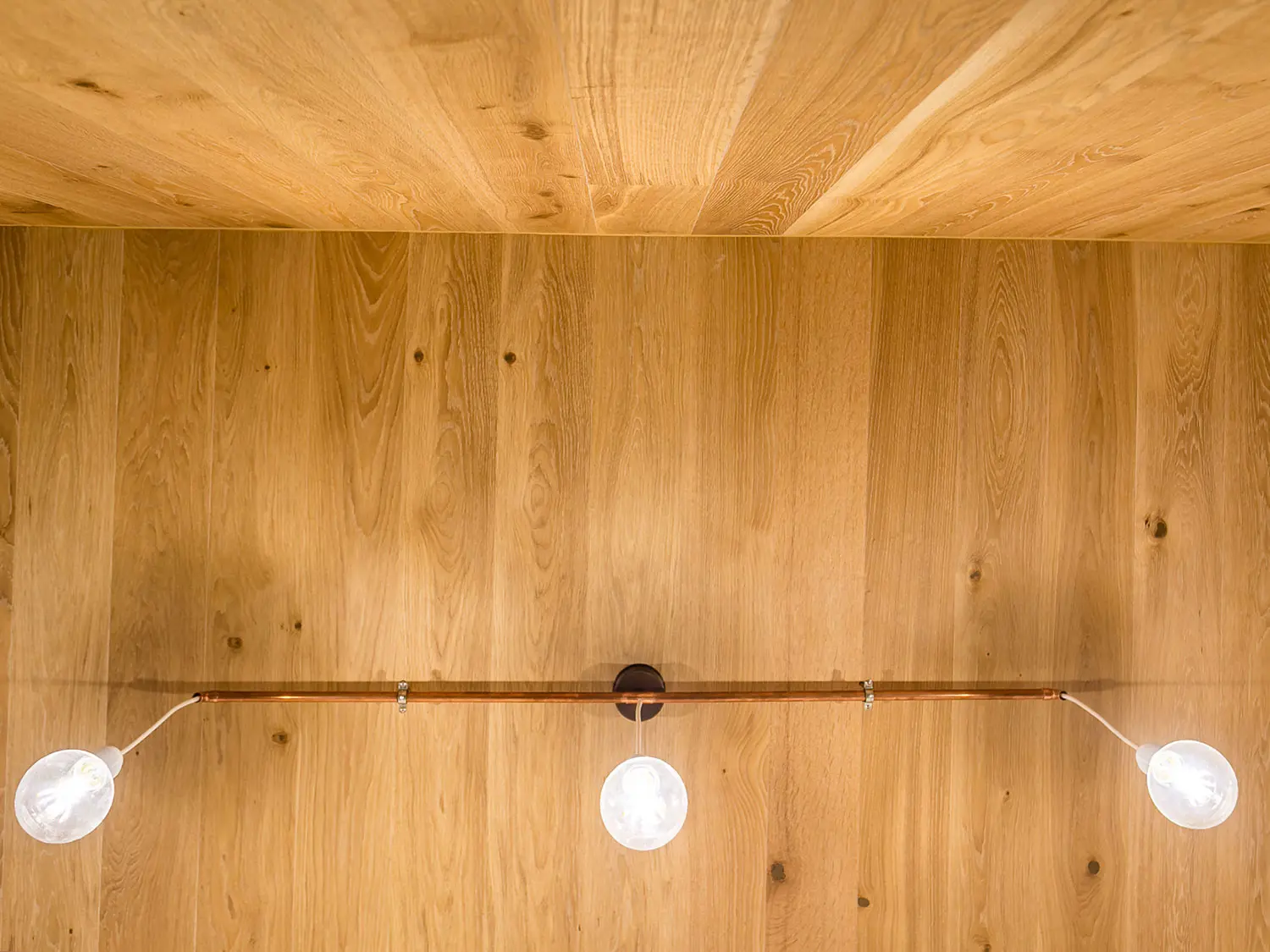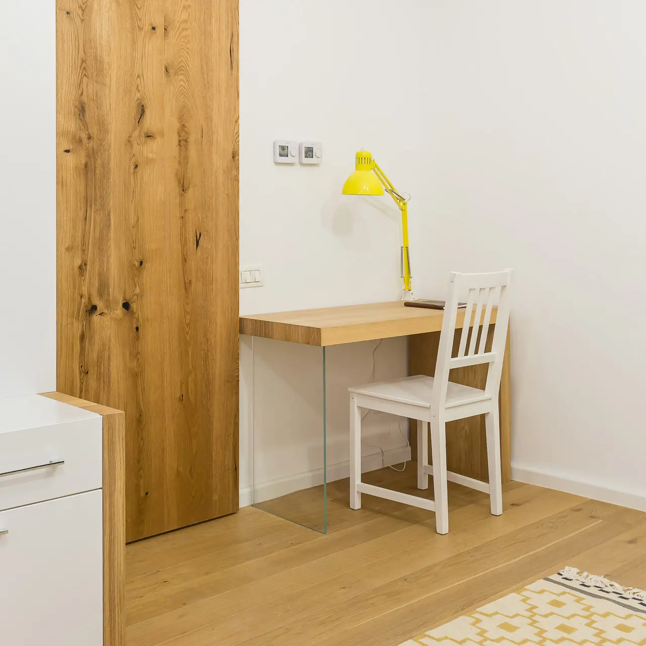 The wood floor, the kitchen countertop, the desk, the ceiling and the wall from the entrance are Oak Old Grey.