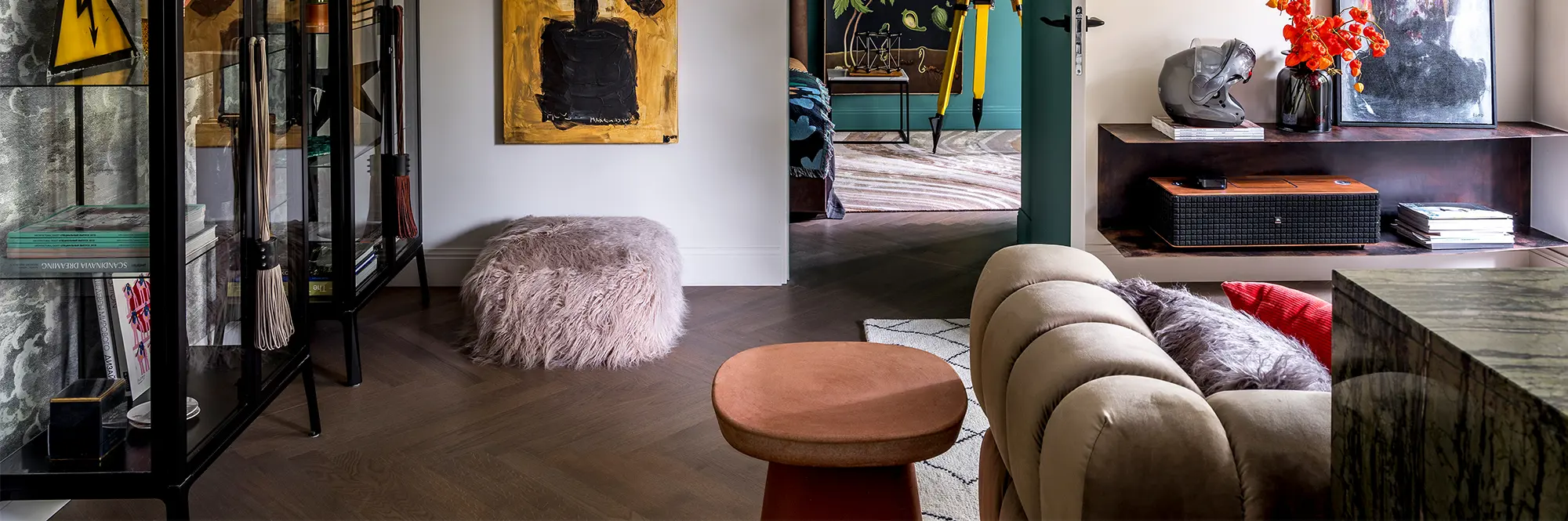 La posa a spina di pesce è un elemento che non passa mai inosservato. Abbinata ai materiali e ai toni di colore di questo appartamento, crea un effetto di grande naturalezza.
