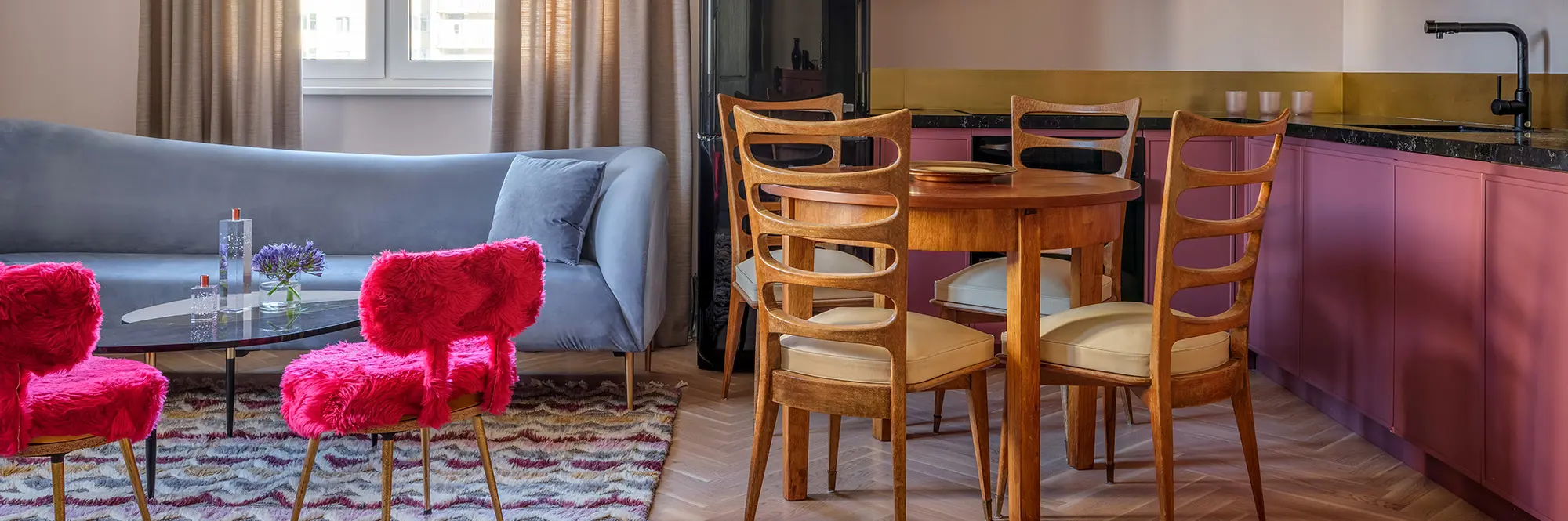 L’appartamento si trova all’interno di un edificio di nuova costruzione ed è di dimensioni contenute, con un unico ambiente comune per cucina e soggiorno e due camere da letto, una per la madre e l’altra per la figlia adolescente. La zona giorno è stata arredata con mobili vintage, un antico tavolo di famiglia e alcune sedie che Nadia ha acquistato in Francia. La cucina, il divano e la parete attrezzata con la TV provengono dalla boutique Enjoy Home. L’obiettivo era quello di creare un’atmosfera vintage e conferire all’appartamento un carattere retrò, che ricordasse lo stile degli Anni ‘50, senza nulla di classico o complicato. Cornicioni arrotondati, battiscopa in metallo, elementi metallici nella struttura della cucina, lampadari vintage in ottone e atmosfera dell’Italia negli Anni ‘50-70: questi gli ingredienti usati per donare all’appartamento un fascino retrò. È stato scelto un parquet dalla tonalità neutra, posato a spina di pesce.