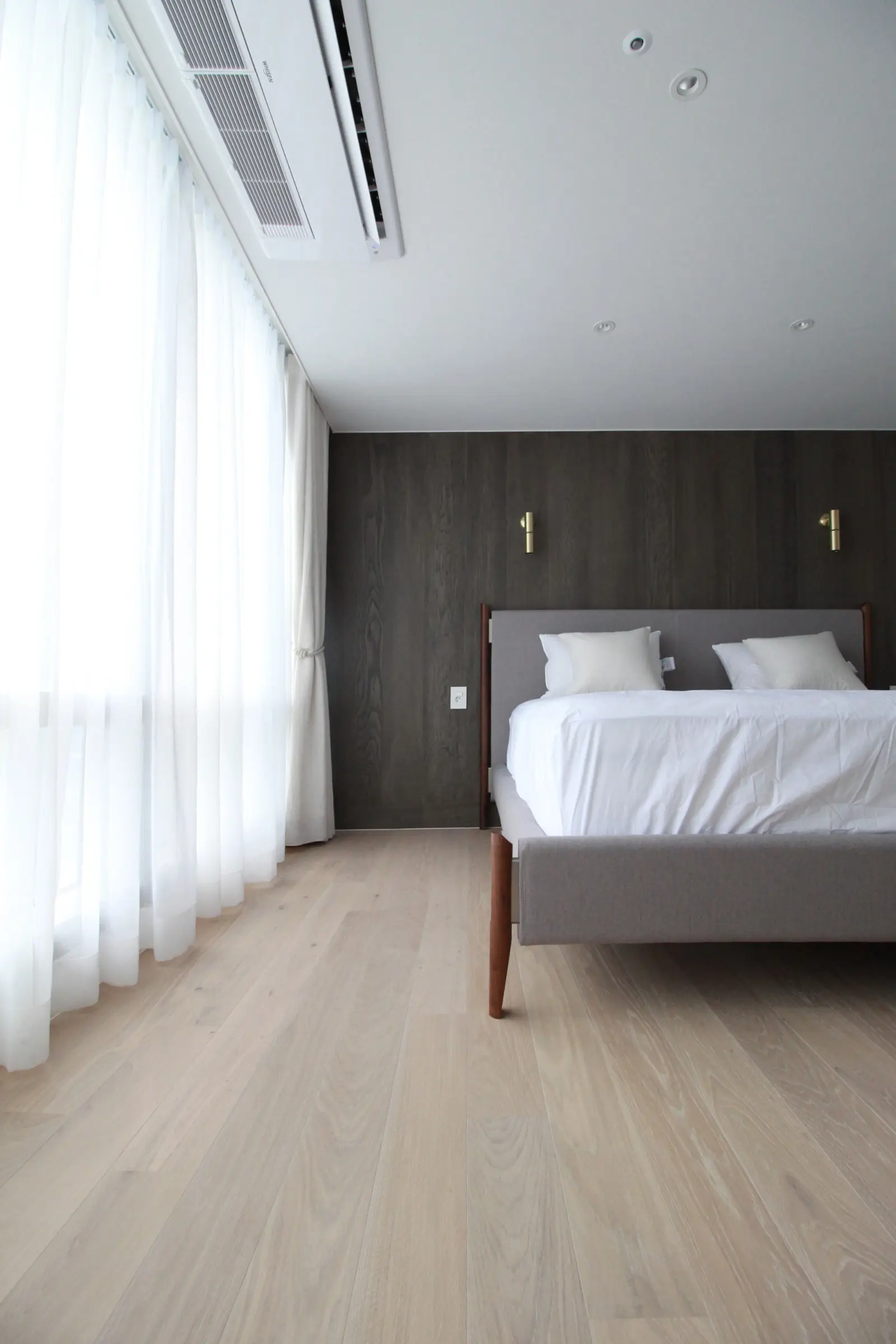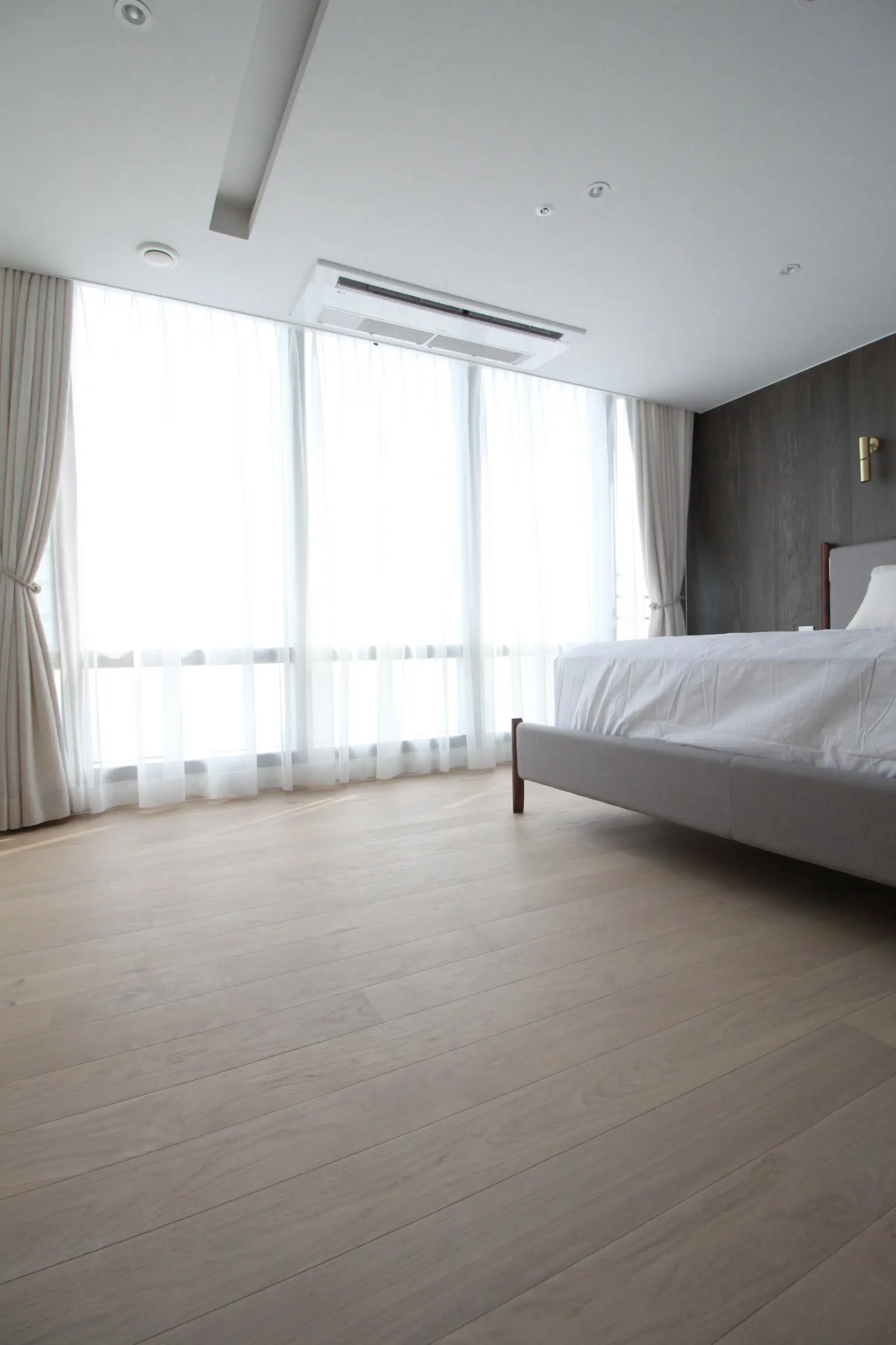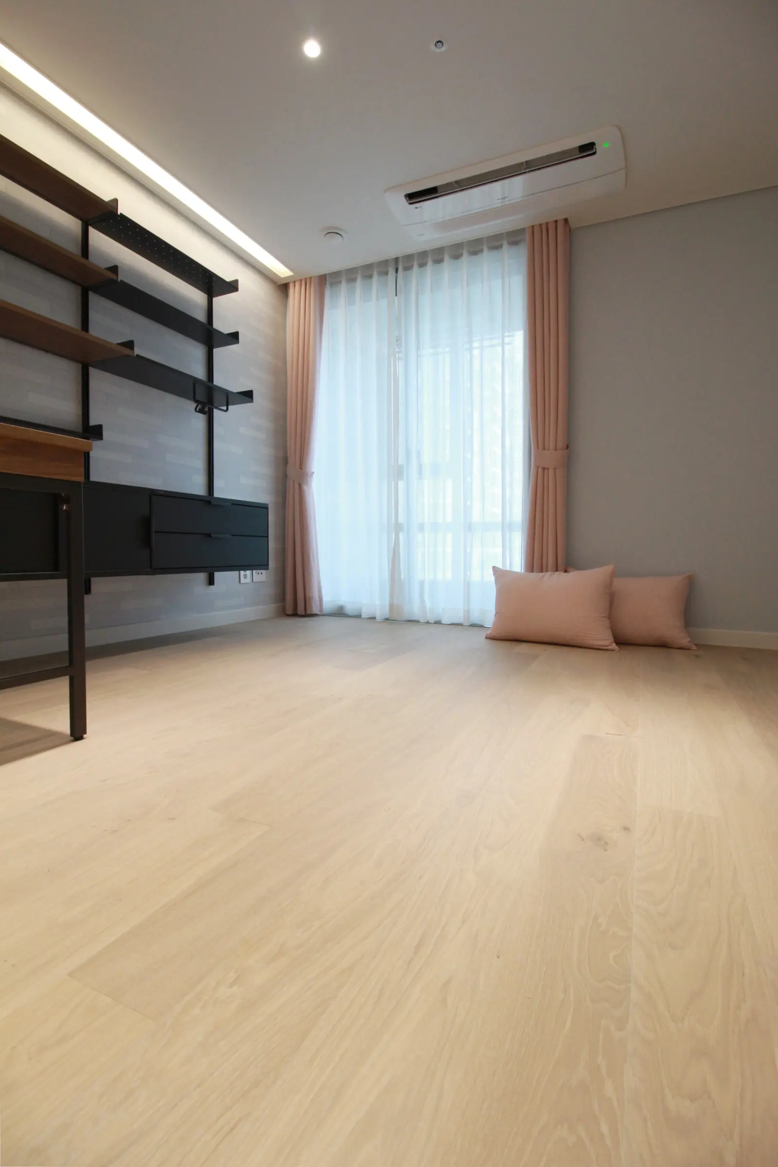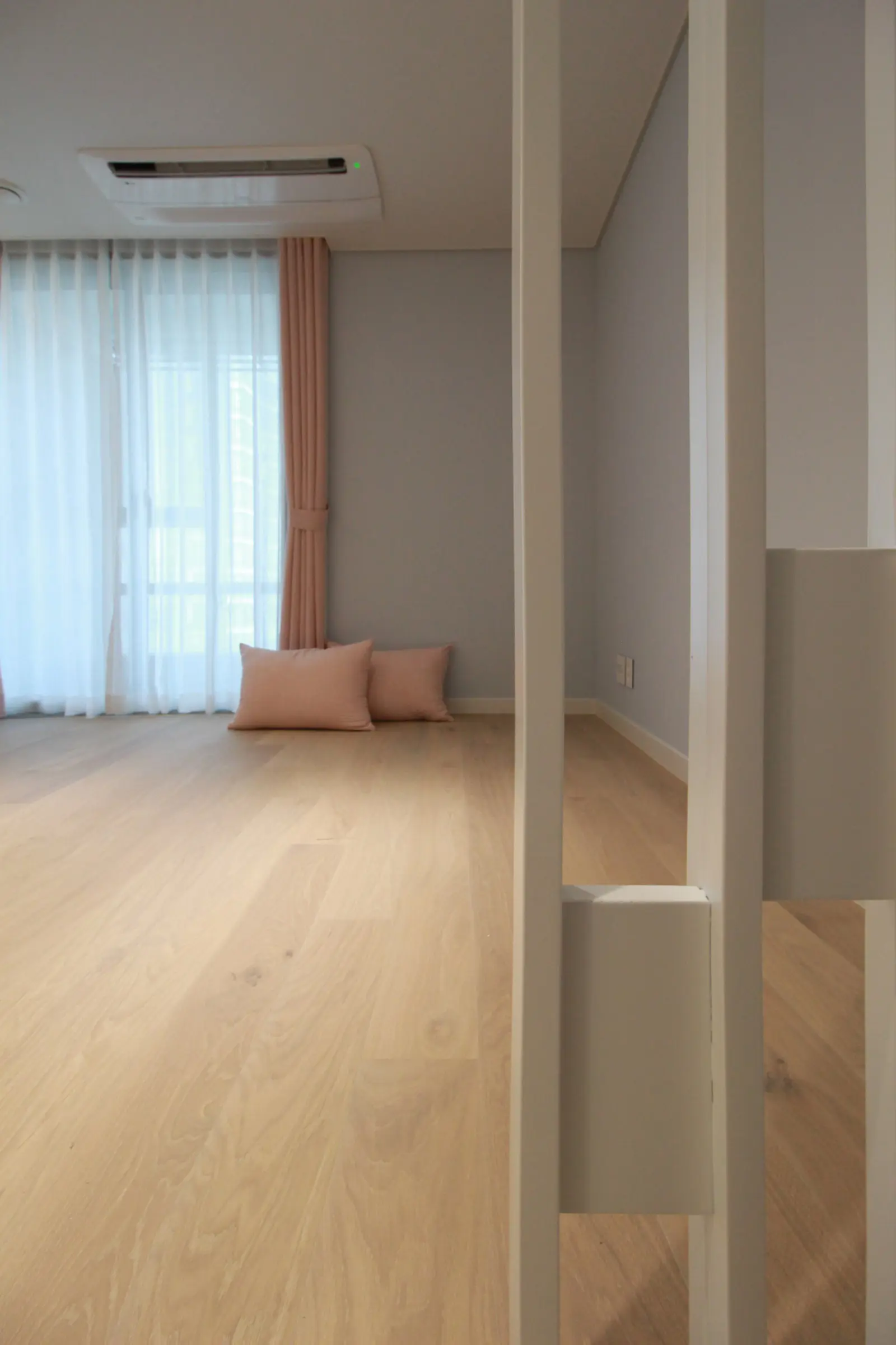 Ąžuolas "Coral" turi švelnų šilto tono atspalvį, kuris puikiai dera su pilka siena, kurią dar labiau sustiprina pro langus sklindanti natūrali saulės šviesa.