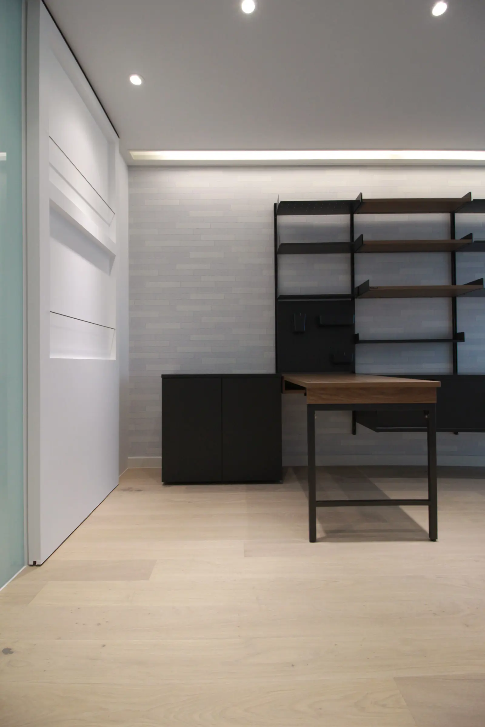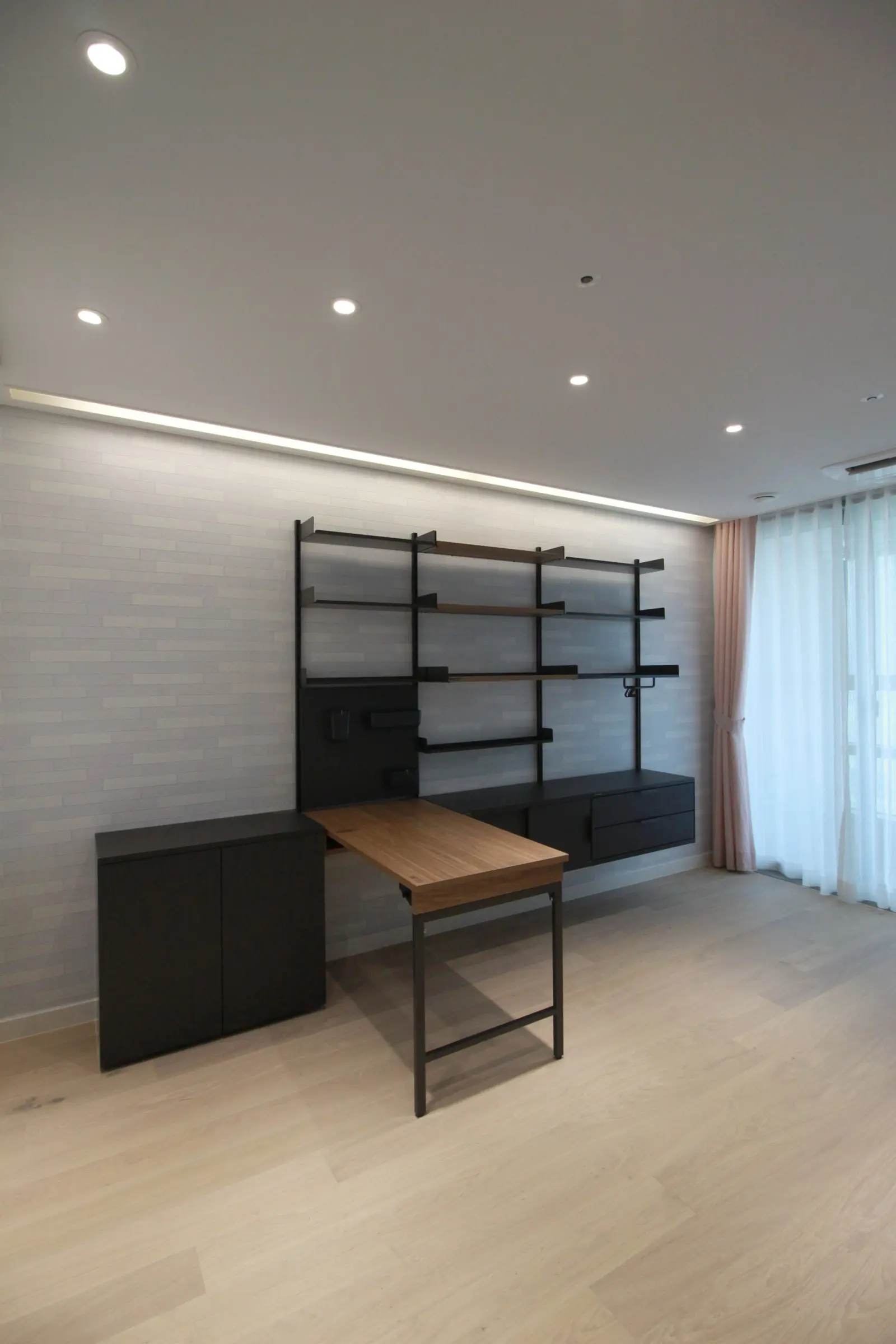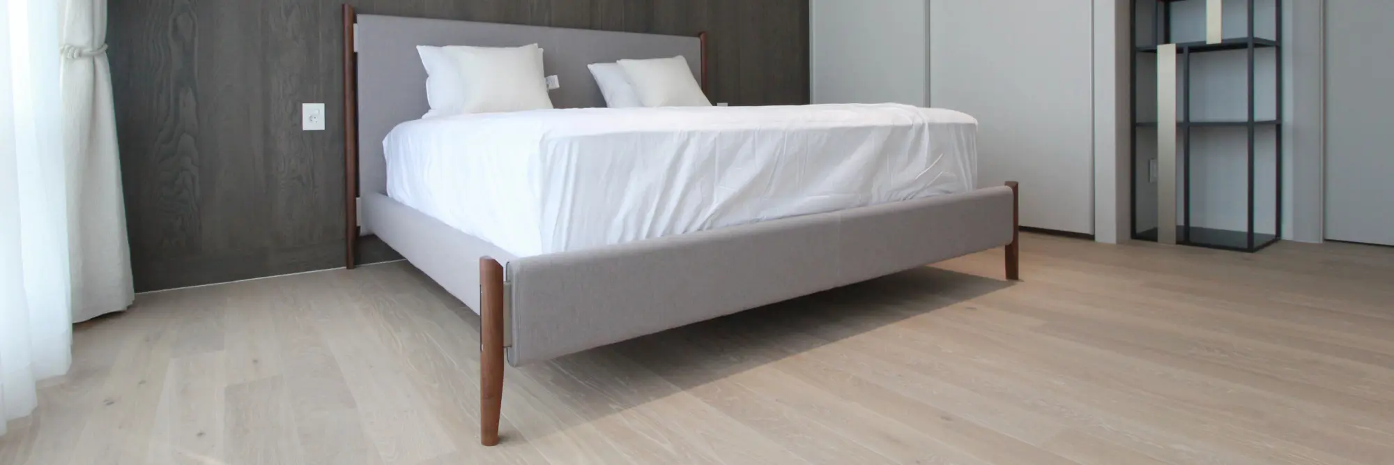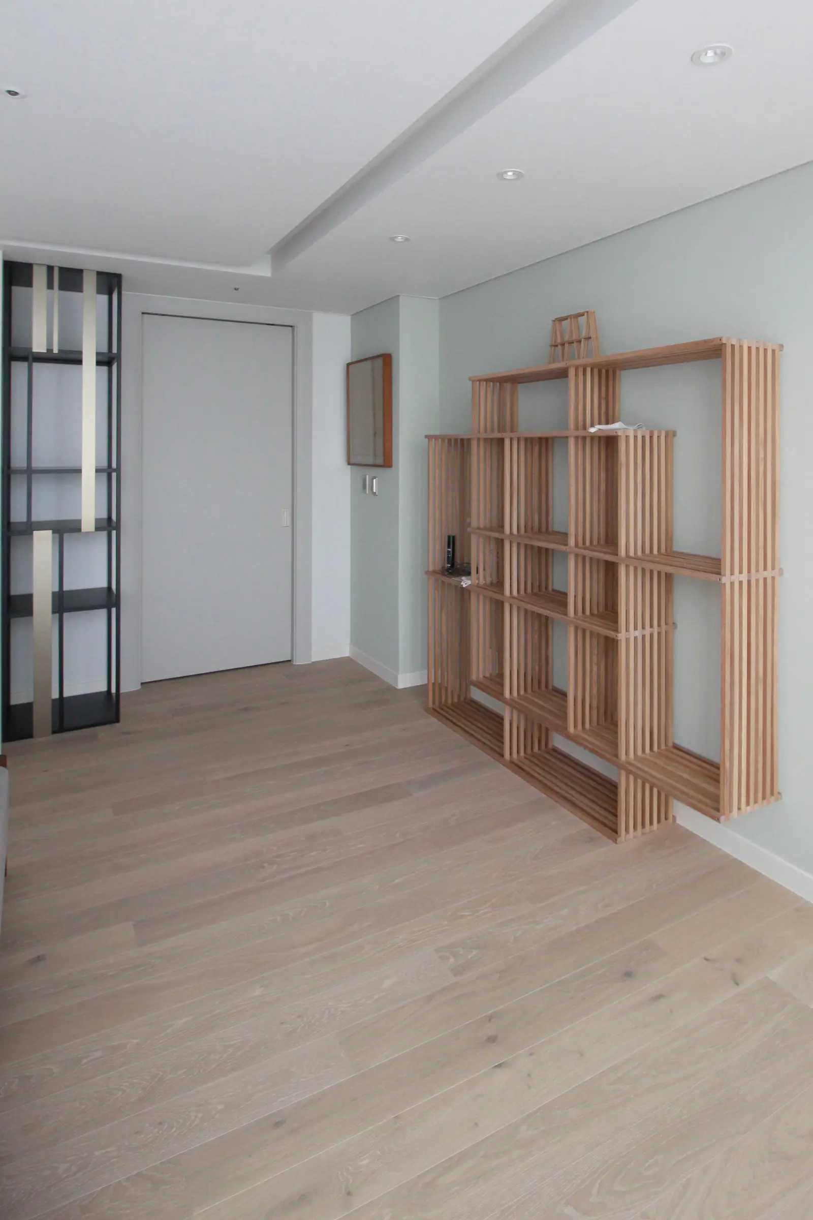 Ąžuolas "Coral" turi švelnų šilto tono atspalvį, kuris puikiai dera su pilka siena, kurią dar labiau sustiprina pro langus sklindanti natūrali saulės šviesa.