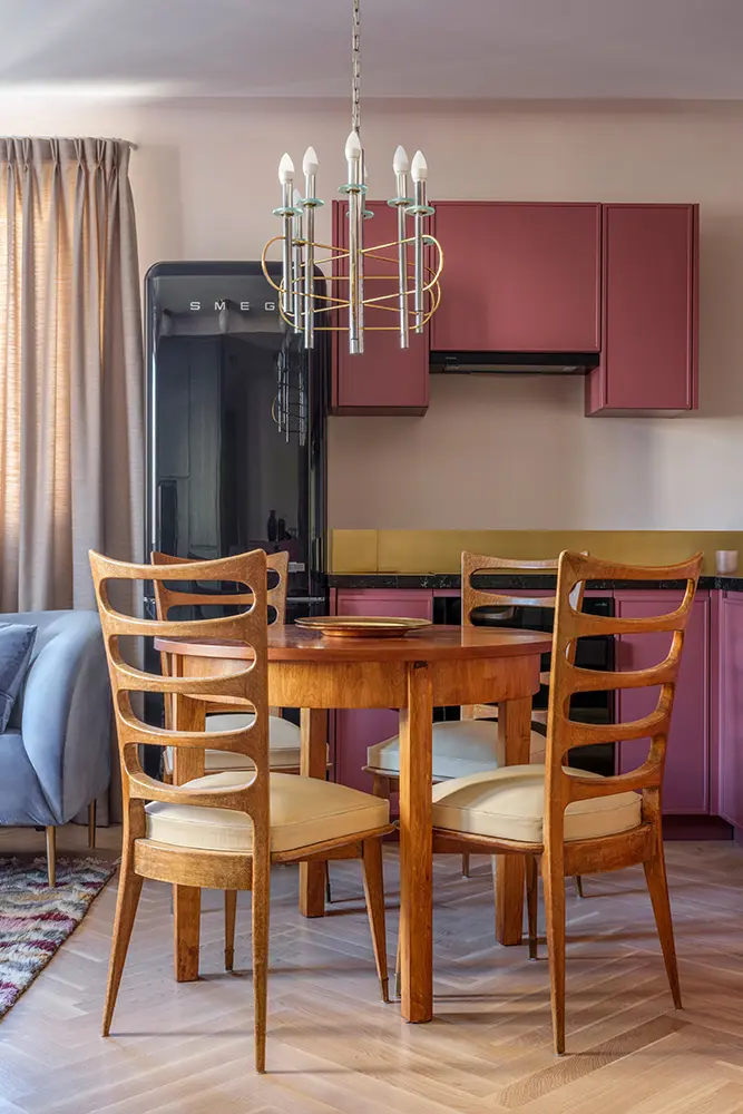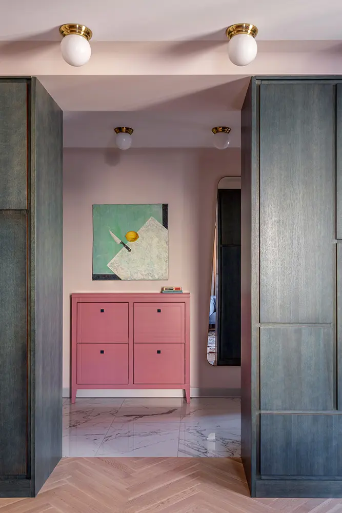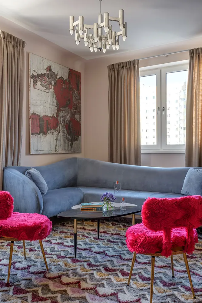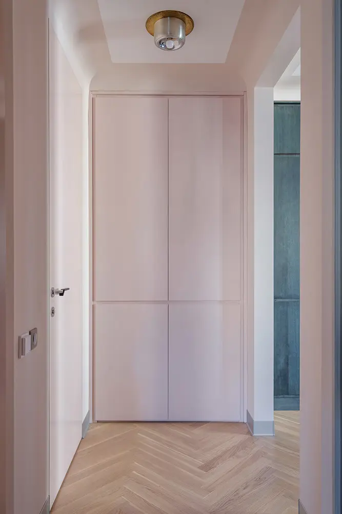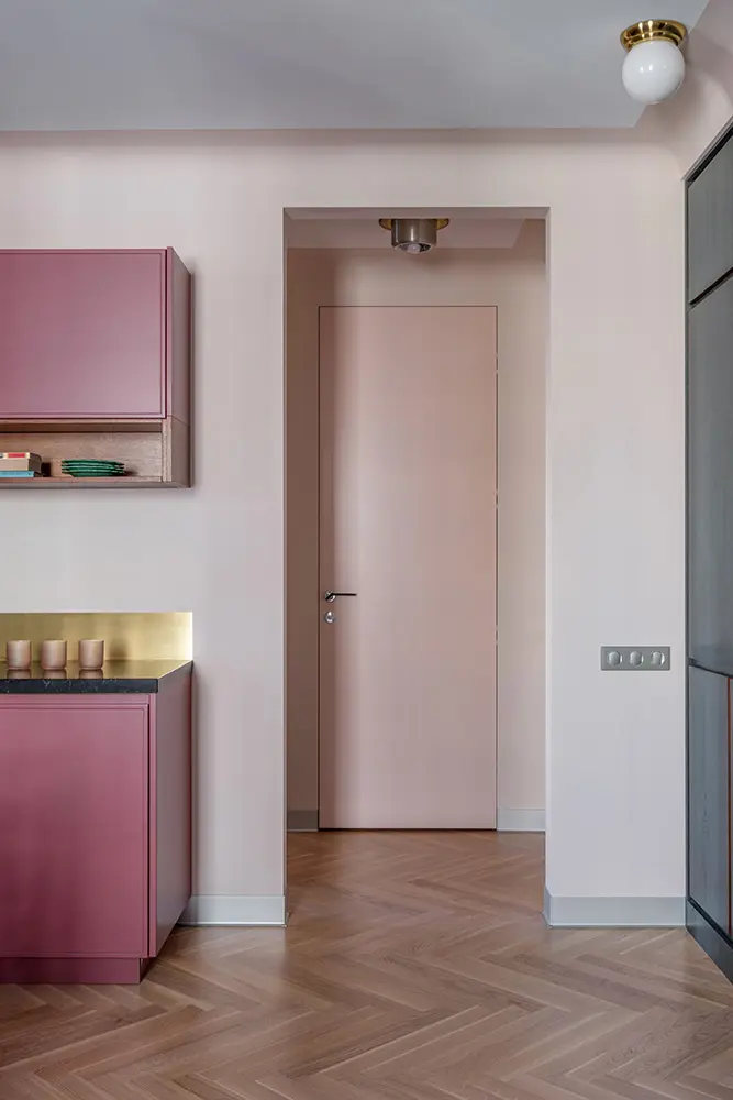 Oppgaven var å skape en vintage-stemning, å skape en retro-ånd i leiligheten med stilen fra 50-tallet. Jeg ville ikke ha noe klassisk og komplisert. Avrundede gesimser, gulvlister i metall, metallelementer på kjøkkenforkleet, messing, vintage lysekroner og en stemning av 50-70-tallets Italia med retrofølelse. Parketten, i en nøytral nyanse, er lagt i fiskebensmønster.