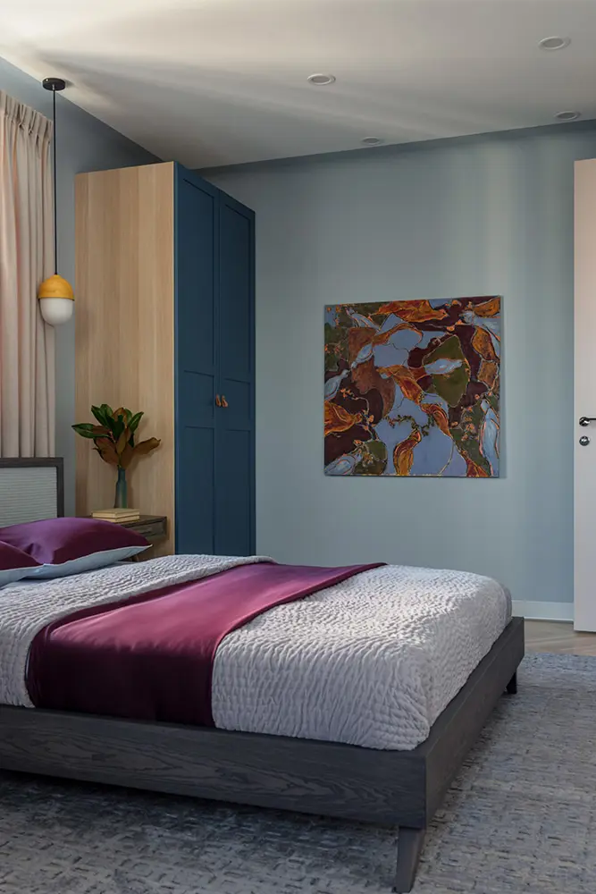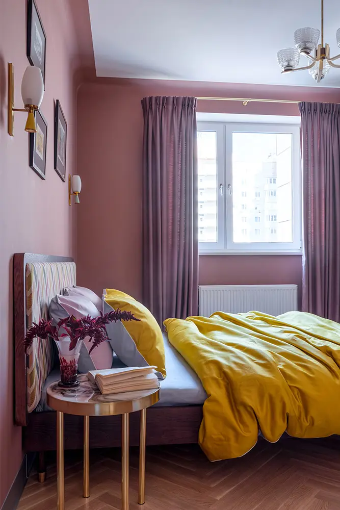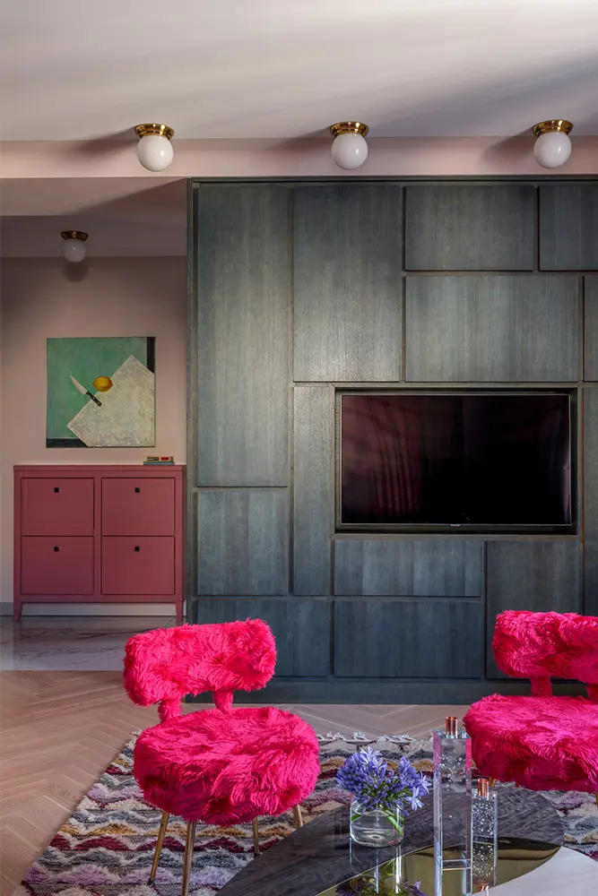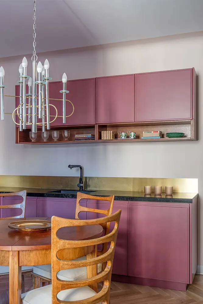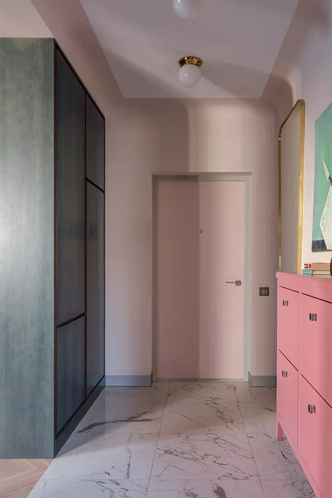 Oppgaven var å skape en vintage-stemning, å skape en retro-ånd i leiligheten med stilen fra 50-tallet. Jeg ville ikke ha noe klassisk og komplisert. Avrundede gesimser, gulvlister i metall, metallelementer på kjøkkenforkleet, messing, vintage lysekroner og en stemning av 50-70-tallets Italia med retrofølelse. Parketten, i en nøytral nyanse, er lagt i fiskebensmønster.