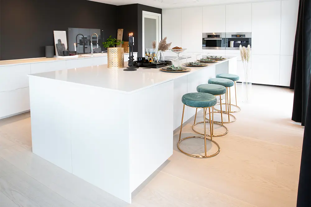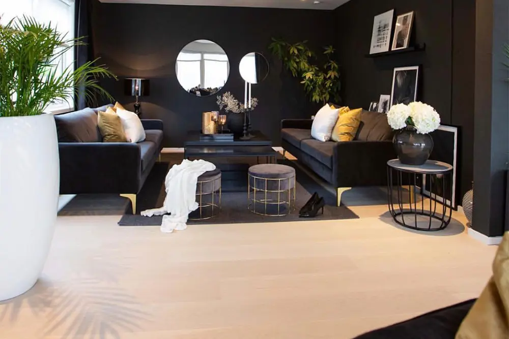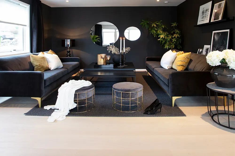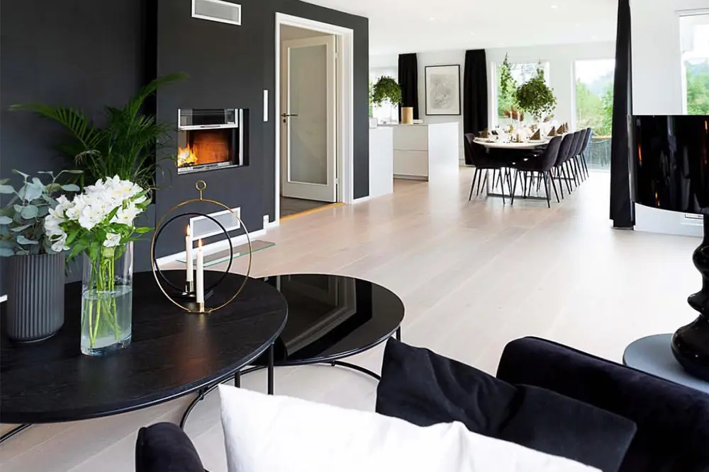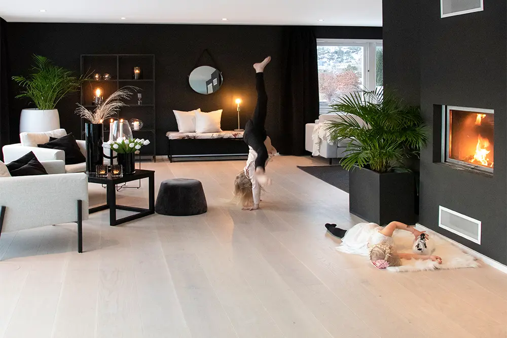 In dit huis in Kristiansand wonen Mona en haar gezin. In het interieur wordt heel leuk gespeeld met de lichte vloer en de donkere contrasten zorgen voor een prachtige balans.