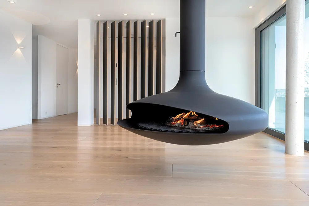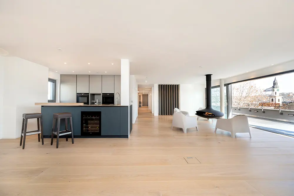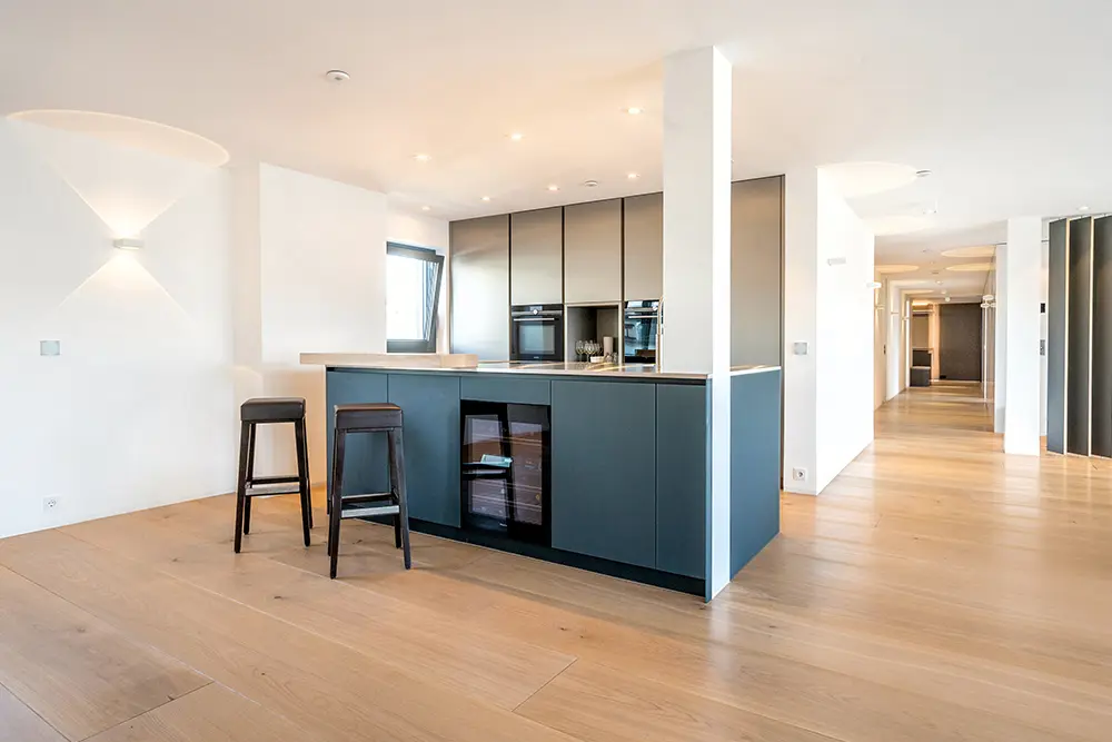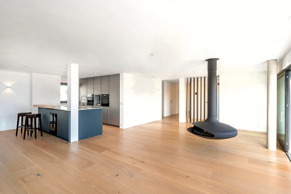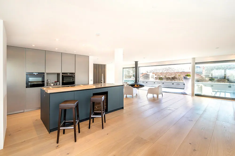 Den breda fönsterfronten släpper in mycket ljus i den renoverade takvåningen och öppnar upp mot utsikten över Stuttgart. I planeringen var det viktigt att använda material av hög kvalitet: köket har bänkskivor i rostfritt stål, extra höga luckor och dörrkarmar som är osynligt inbyggda i väggen, den nästan osynliga dörren till hissen öppnas och stängs automatiskt.