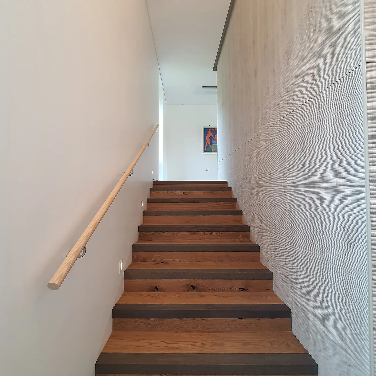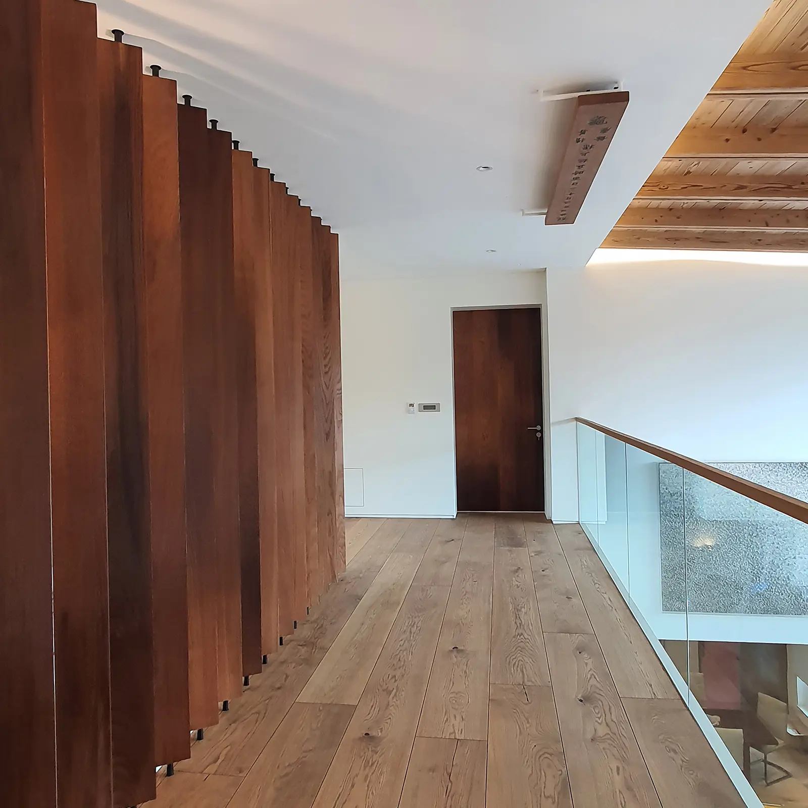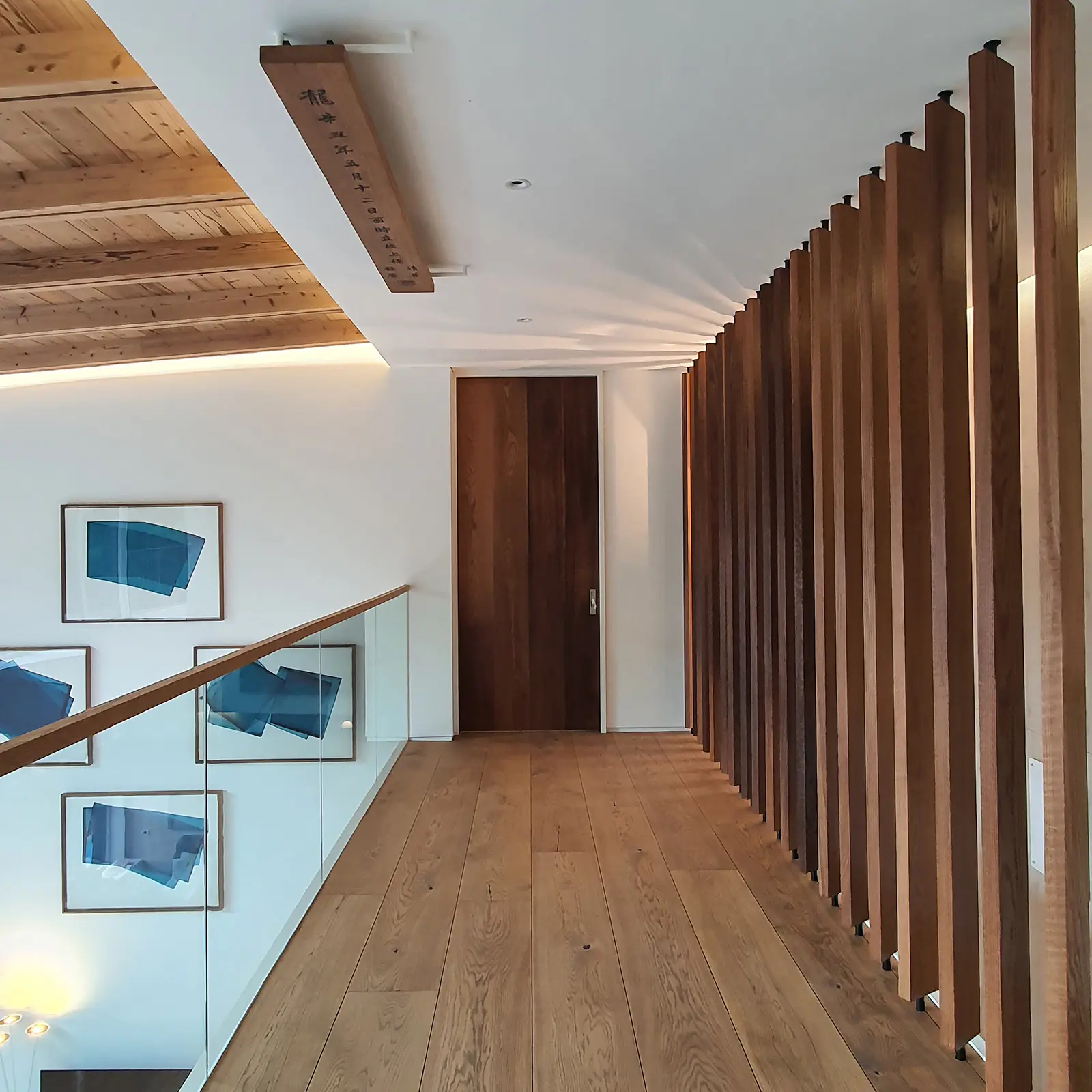 H Design Group designade och installerade golv och trappor med våra Chaletino-produkter. För att göra det lättare att skilja trapporna åt installerades trappnosarna med olika träslag.