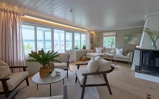 I det tredje avsnittet tar inredningsarkitekten Halvor Bakke och hans team oss med till en väderutsatt stuga längst ute i havsbandet på Drengeneset.